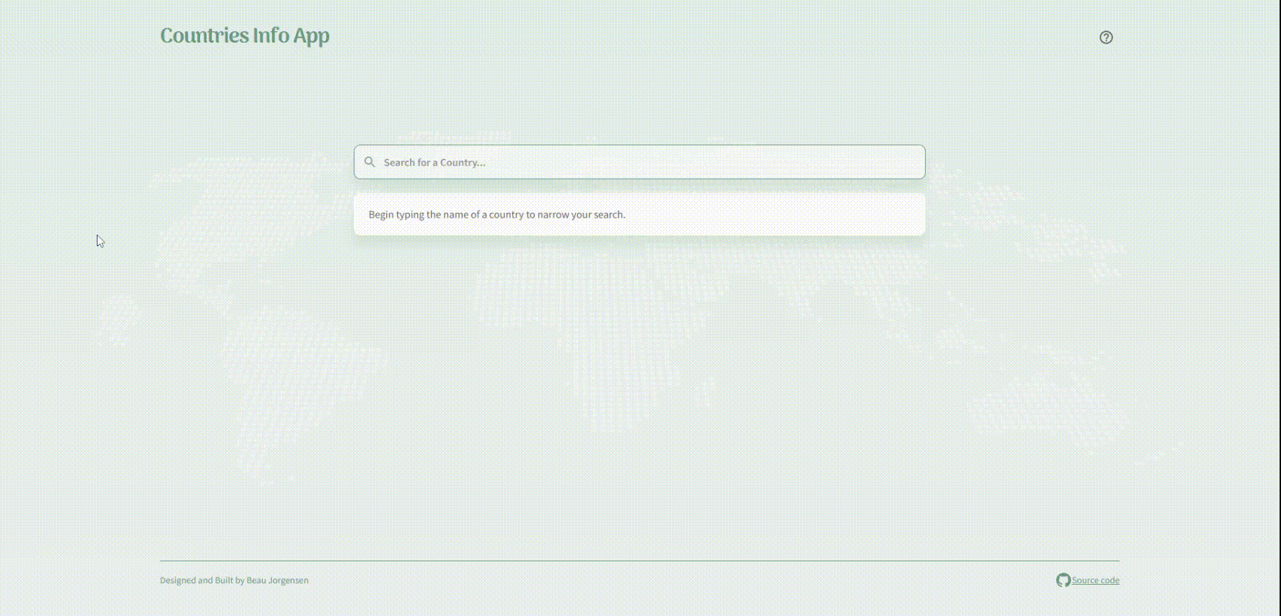 'Countries Info App' was built with React and pulls data from two APIs - the restcountries API and the openweathermap API and shows the user a basic overview of information about the selected country, as well as the current weather in the capital city of that country. Although it's a fairly simple app, I've used it as an opportunity to explore properly styling the UI. I started in Figma and worked my design into the HTML and CSS of the app.